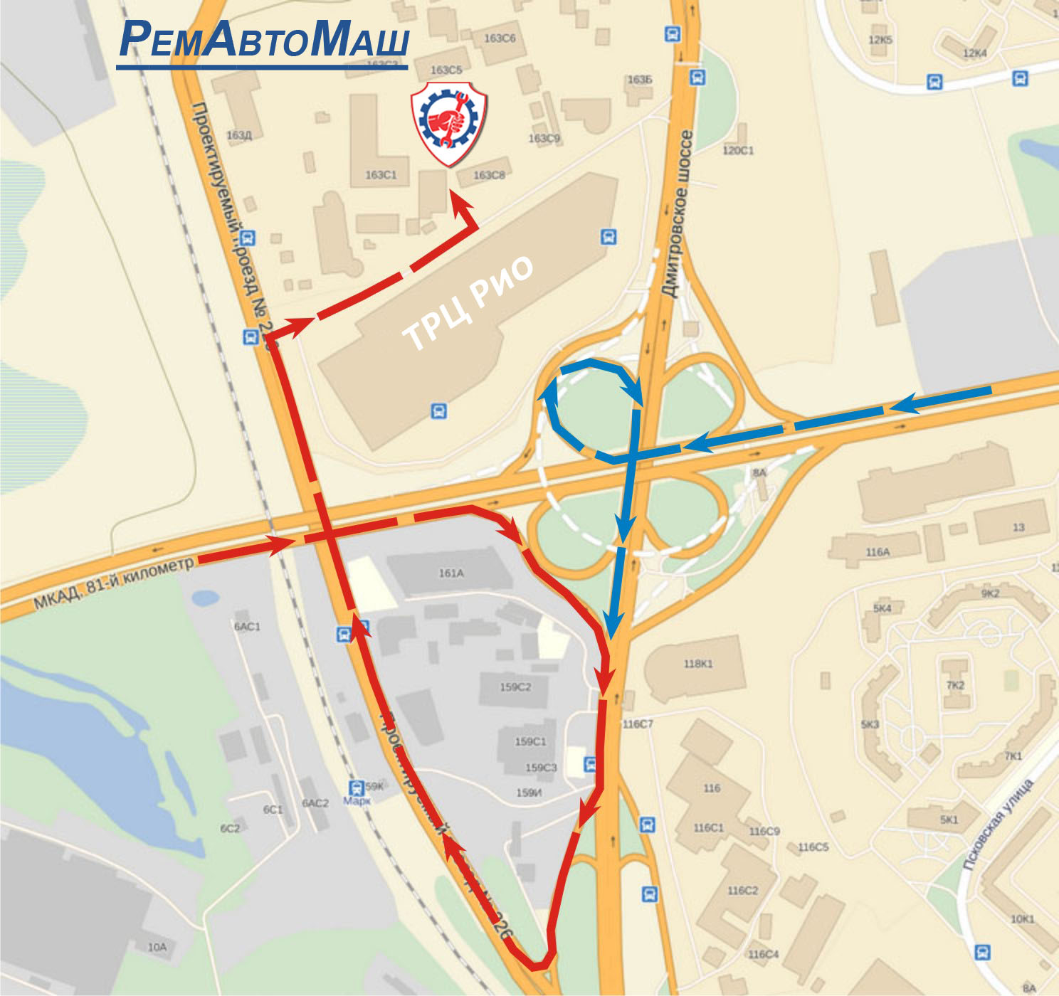 съехать на Дмитровское шоссе в сторону Москвы, после автобусной остановки повернуть на Проектируемый проезд №226 в сторону области и после ТЦ «РИО» повернуть направо до въезда в автобазу Ильинское. На карте по синей стрелке.